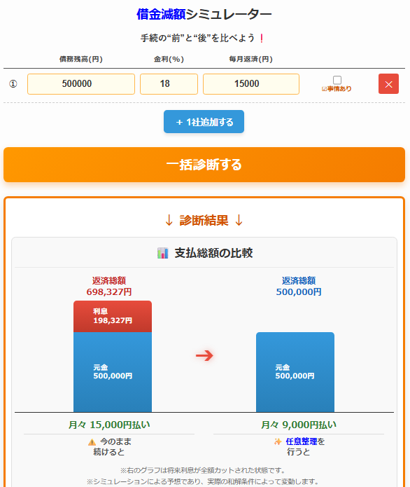 もちろん、シミュレーションをしたからといって依頼の義務はありません。まずは自分の借金がどれくらい減る可能性があるのか、ゲーム感覚でポチポチ試してみてください。