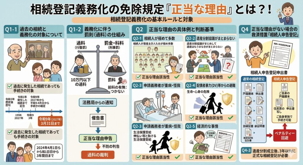 もっとも、法律は、物理的・社会的に実行不可能な行為を国民に強制することはできません。そのため、法務省が策定した運用ガイドラインや通達においても、「相続人が極めて多数で、必要書類の収集に時間を要する場合」は、登記義務違反の「正当な理由」に該当すると明記されています(令和5年3月28日民二第538号民事局長通達における趣旨に準拠)。ただし、この免除規定は、単に放置してよいという意味ではなく、登記義務者が戸籍収集などの手続きに「着手」しており、真摯に義務履行に努めているプロセスが評価されることを前提としています。全く手をつけていない怠慢状態では正当な理由として認定されないリスクがあるため注意が必要です。